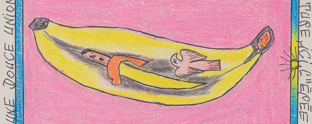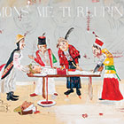 It's not a bird. It's not a plane. And it's definitely not Superman. But on the right side of Enrique Chagoya's canvas, you can make out part of the Man of Steel's familiar logo. SUPER is spelled out in the familiar block lettering but the word is reversed (REPUS) and falling off the chest of a Frankenstein-like figure. The face doesn't belong to Kal-El, the comic-book alien sent to Earth from Krypton. It's a jumble of seven or eight faces collaged together. Supergirl's cape is flying freely behind her back but the logo covers her face and upper torso. Superman himself does make an appearance. He's flying straight into the "S" but you can only catch a glimpse of one full leg and both of his red ankle boots as they disappear upwards. » Read More
