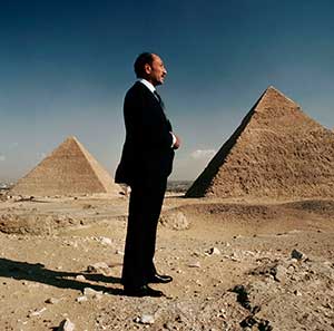 PAST AND FUTURE: In David Hume Kennerly's color coupler print 'Anwar Sadat, 1977,' the Egyptian leader poses in front of his country's most famous monuments. Gift from the Alinder Collection