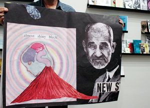 About 300–400 new zines comprise the current show. All a visitor has to do is walk into the gallery and find a few titles to identify with. I chose Media Whore, Scumbags and Superstars, Functionally Ill and Cranky Buddha. That last one features an octopus on the cover and advertises "Religious tomfoolery, 17th-century dildo poems and much more."