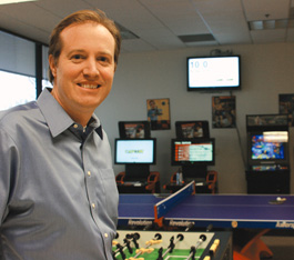 ALL WORK, NO PLAY: Dane Jasper in Sonic.net's break room, which sits tellingly empty of employees as a monitor warns of 10-minute wait times for support calls.