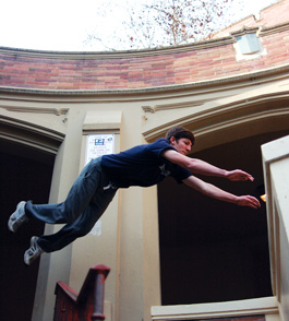 In contrast to De La Rosa's gym gear, Fulmer is in jeans, black-frame glasses and a tight black T-shirt. At just 21, he has several physical parkour trophies: calluses across his palms and a sizable calcium deposit on his shoulder, like a sub-epidermal doorknob. He hooked up with Bay Area Parkour a few years ago and started their monthly "jams,"gatherings of enthusiasts in different cities around the Bay Area, and now teaches "pure" parkour, venomously eschewing the "free running" approach of wall flips and showy tricks. His goal for me today is to land a double kong, whatever that is, and he's got about 20 minutes to do so before the next class starts.