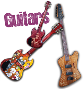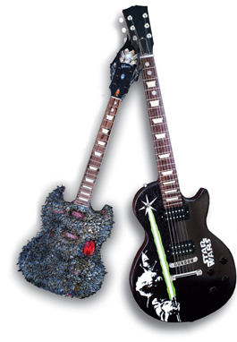Les Claypool's "How to Play Bass" guitar or George Lucas' Yoda light saber guitar? Stan Lee's baseball-card-collage guitar or John Lasseter's googly-eyed tongue guitar?