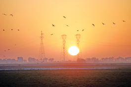 Dawn on the Delta. As the sun peeks out from behind the John A. Nejedly Bridge near Antioch, a small flock of terns flap up to the concrete trusses and rest on a set of nooks in the construction.