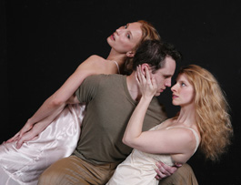 Rightly considered to be among the very best American plays ever written, Streetcar, which just opened a three-week run at the Marin Theatre Company, has proven to be a difficult play to stage, in part because of Brando's indelible, unmatchable performance, and in part because the play is so easy to ruin by overplaying or underplaying the drama. The current production at MTC, under the direction of Jasson Minadakis, manages to avoid the disasters that so often happen with this very tricky play, and occasionally hits peaks of genius, mainly through the solidly sexy-slutty-crazy-classy performance of actress Carrie Paff (top left, above) as Blanche, the unstable Southern belle whose tentative grasp on reality is shaken when she visits her sister, Stella (Arwen Anderson), and Stella's primal, impulsive husband, Stanley (Daniel May, physically tense and as watchful as a tiger).