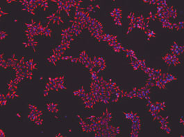 DISHIN' IT: A fluorescent microscopic image of neural precursors generated from human embryonic stem cells. The neural cell bodies are visible in red and the nuclei in blue.