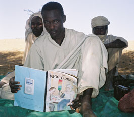But the cameras came in handy, even for addressing immediate problems. There's one moment in the film where we meet Ibrahim, a former farmer who now fights with the Sudan Liberation Army in Darfur, and who hasn't seen his wife, mother or children, all living in a refugee camp in nearby Chad, for 11 months. The filmmakers record a message from him to his family, whom they amazingly locate among the 24,000 people living in a Kariare refugee camp. From the midst of the chaotic, dusty camp, the family watches Ibrahim on the tiny camera screen, and as his mother reaches out to touch his image, you can feel the sense of relief they feel, finding out that he's OK.