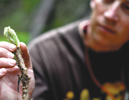 RESINY EDIBLE: Cook holds a newly emerged bud of the 'rather argumentative' devil's club plant.