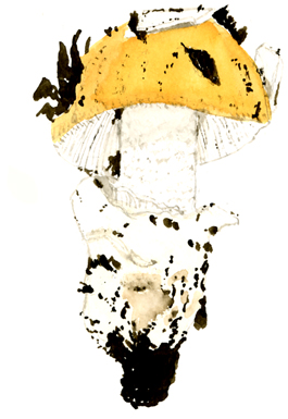 Foraging in a new location revealed minor variations of familiar species. Whether these were new varieties or just environmental adaptations is difficult to say without DNA analysis. Weekly visits provided the opportunity to observe patterns of succession. The previous week's enormous fruiting of small inky caps precipitously declined on my next visit, but the tough twisted cup fungi increased, although many were dark and moldy. Watered lawns brought up tiny grass fungi. By mid-March, after the rains had stopped, almost all the mushrooms I saw were repeats. There were still hundreds of tan spring agrocybes with cracked caps in the wood chips, and dozens of handsome spring amanitas under live oak along East Redwood Avenue, but I had already painted them. Occasionally, I called something a new variety of a familiar species just to keep my search going. By April, the spring fruiting was over and my documentation ended.