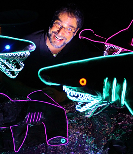 Williams began experimenting, and returned to Burning Man in subsequent years with various el wire art projects—horses, UFOs and "alien bug things," all strapped to remote-controlled monster trucks. For the underwater-themed year of Burning Man, six years after he began working with el wire, he crafted his most popular and intriguing piece of work to date: a four-foot neon shark named Sparky.
