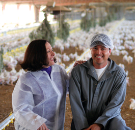 LIGHT: Owner Mary Pitman jokes with production supervisor Jaime Caballero at one of Pitman Family Farms' free-range facilities.