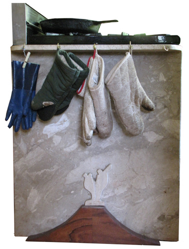 Every evening while Maile cooks dinner—almost all homegrown and made from scratch—Warren reads her poetry. Seamus Heaney is a favorite, Maile says, because "he relates to how it feels to be on the land, digging peat and planting potatoes." The kitchen stove transforms into sculpture with the addition of a marble and hardwood volcano.
