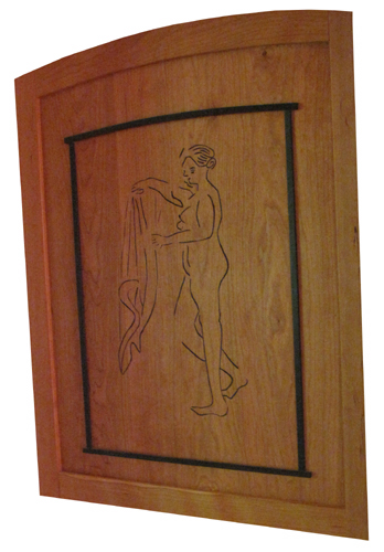 An abundance of art by the Arnolds' friends grace their home, especially paintings by Bill Wheeler. Much of the furniture and three of the doors are handcrafted by master woodworker, James Stadig. This cherry wood door features a nude echoing a woodcut by Wheeler.
