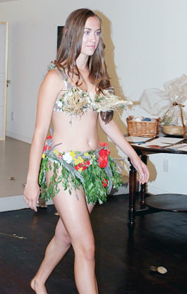 Once the models began walking, the crowd settled down. The fashion show started with botanical couture by Theron Nelson Designs. Nelson happened to be standing next to me, still holding a pair of garden clippers in one hand. He'd been working since the day before to make outfits crafted entirely out of leaves, flowers and dried grasses. While a bikini made out of straw and leaves cannot be pulled off by just anyone, the models did justice to his work, and though the ensuing organic-wear was not quite as exciting as Theron's more minimalist style, the mood was properly set.