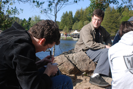 However, geocaching is fun and safe as long as one obeys the law and remembers not to cross Homeland Security. Laeder says it's mostly parents who take their kids up to look for a cache, and that it's mostly the hairy survivalist types, not geocachers, who get in the way of the park authorities. D'Arcy and Livingston ditch the plan to get onto the island and head out for the next cache, located on a peninsula at the farthest edge of the lake. They find it hidden in a niche in a rock; inside it is an array of odd stuff: a piece of paper with a story about Merlin, lots of little pieces of Lego toys, a quarter, a stamp and a metal washer. Also in the container is a little logbook with the times and dates of the cache find. According to the logbook, someone else found the cache just a few hours earlier.