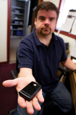 CALL WAITING: Dave, a staff member at Redwood Gospel Mission, holds one of many cell phones used by a transient clientele.