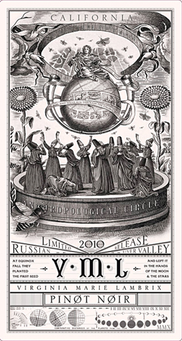 Tasked in past and present endeavors with Biodynamic winegrowing, the young winemaker came to the practice after an early career in science. While VML wines are not labeled as such, many are sourced from vineyards that practice organic and biodynamic-style viticulture. When the artist who created VML's new labels learned this, he said, "'Ah, so you're a witch!'" laughs Lambrix. The latest releases sport a rather wild design that's a mashup of an Albrecht Durer engraving and a sort of 19th-century steampunk seed packet.