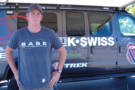 DRIVER's SEAT: Dwight Upshaw drives professional triathlete Chris Lieto to all his races in a biodiesel van, which also serves as a hotel room for them and as a 'green' educational booth.