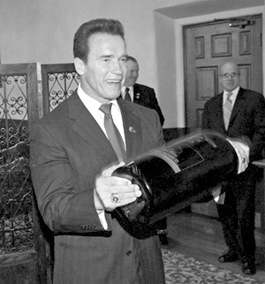 You've heard more than once that Gov. Arnold Schwarzenegger rejected Zinfandel boosters' hopes for an official heritage grape proclamation. Perhaps you've even read the proper noun "Gov. Arnold Schwarzenegger" more than enough. But the Governator has agreed to pump up California wine in general, proclaiming September to be "California Wine Month" for the third consecutive year. He "applauds California vintners and winegrape growers," and retailers and restaurant chains like Safeway, BevMo and Trader Vic's pile on to highlight California's status as a churner-out-er of a stupendous quantity of wine. (It's at least worthwhile to Google Schwarzenegger's action-photo from last year's press release, in which he appears to be pressing a few reps with a seriously outsized wine bottle.)