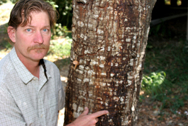Case in Point : Biologist Brock Dolman underscores the tell-tale weeping black signs of SOD on his property.