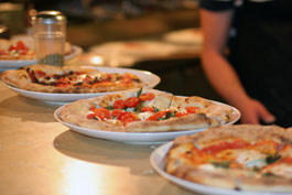The dough is made daily from scratch using Caputo 00 flour. Pizzas are expertly tossed to order before heading into the wood-fired oven. Upon exit, they're drizzled with olive oil and Grana Padano cheese.