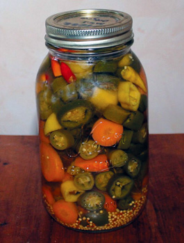 Add a teaspoon of salt and a tablespoon each of yellow and brown mustard seeds to the bottom of each quart jar. To make Mexican-style peppers and carrots, aka escabeche, add a tablespoon or sprig or two of oregano as well.