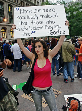 "This movement is going to keep growing. You've got millions and millions of pissed-off Americans," filmmaker Michael Moore predicted at the first occupation of Wall Street Sept. 17. Deepak Chopra, also present, encouraged a spirit of compassion, claiming that the injustices were "created by fear and greed" and that a protest conducted in anger will only perpetrate more fear and greed and anger. "Ask yourself internally," said Chopra, "What kind of world do you want to live in?"