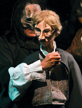 Working within a large puppet stage "set" adorned with images of writhing figures, a team of three puppeteers (Bishop, Fuller and Eli Bishop) operate the somewhat vocally muffled characters in full view of the audience, the actors' faces tucked away behind mysterious masks. The script—lyrical and full of humor, but occasionally somewhat baffling—focuses on "the creature" as an abandoned boy-child, less a monosyllabic monster than a heartsick wild man. Gone are the horror/science-fiction clich–s (no electricity, no grave-robbing), replaced by a more intimate story of a damaged, increasingly angry soul in search of love, who, denied the family he desires, ends up settling for revenge.