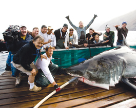 HOOKED: Dr. Michael Domeier (arms raised, center) and his team boat a great white shark near the Guadalupe Islands in this undated photo. The animal, a female, was tagged and released.