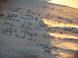 4-16-08: 'I sure do miss you' begins this poignant note placed on a grave at the Forestview Cemetery (also known as the Forestville Odd Fellows Cemetery). Our dry summers keep such fragile momentoes intact far into the autumn.
