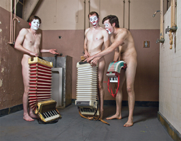 "I am August," says Iocco. "Well, my clown partner Lindsey and I are both August." In the photo, which conjures recollections of old 1960s folk music albums, Iocco, in full clown makeup, is perched naked on a park bench, her more sensitive areas tastefully covered by the guitar she is playing, as Lindsey B. Jones, reclining on the grass, plays a small ukulele. The rest of the calendar is a playful array of poses and postures, all of them clever, some of them ingenious, most of them celebrating some acrobatic or introspective aspect of the fine art of clowning.