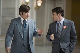 In this telling, Harvey Milk began as just another furtive gay guy on the IRT, picking up one Scott (James Franco) on a staircase, leaning against him against the white tiles of an off-screen subway station. This is the evening Milk turns 40, and he's a little too old for this pickup. But he has a good way with words and manages to convince Scott to come home with him.
