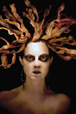 Bacon has always held a place at the breakfast table, but the slippery delight has lately been relegated to nothing more than a way to feed a greasy-fatty food fix. That is, until Bigi Voix, a staunch vegetarian, had a life-altering brush with bacon that forever changed her and the Bay Area art scene. She fell off the vegan wagon over a bacon-binge weekend and became inspired, or more like obsessed, by pork in strip form. Her passion evolved into a photography collection, where bacon interplays with Voix herself as model.