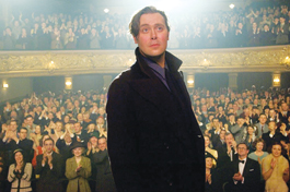 Shooting at a restored old theater in Douglas, on the Isle of Man, Linklater recreates Welles' New York staging of Julius Caesar in fascist black-shirt costumes. This was a stripped-down shocker of a production that lasted one hour and 45 minutes without intermission. The stage scenes are the most compelling in the movie; we can see effect of "Nuremburg lighting" in the finale and the quotes from Mussolini's anthems in Marc Blitzstien's score.
