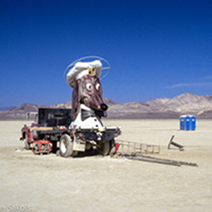 They transform Nevada desert into California beach. Just add water. An Arabian sheikh wearing a cloak fashioned from designer sheets pedals aimlessly on a mountain bike. People circle listlessly in ATVs, dune buggies, tricycles, skateboards, rollerskates, scooters. A guy skims across the playa in a deranged landsailer: a four-wheeled plastic horse with a windsail.