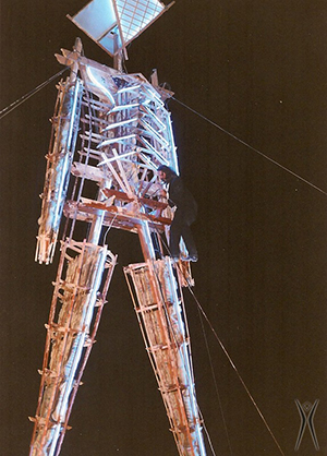 The Burning Man is the creation of Larry Harvey, who specifically disavows any spiritual meaning, yet speaks fervently about the Man. Eight years ago, Harvey was looking for a way to cheer himself up after a relationship broke up. On a whim, he decided to burn a wooden man on the beach, in the tradition of the summer solstice. He called his friend, carpenter Jerry James, and they knocked together an eight-foot-tall figure, gathered a dozen friends on the beach and burned it. The sight of the man, arms blazing against the night sky, was far more moving than they anticipated. Each year the Man grew larger, and by the fifth year the police arrived in time to stop the burning and nearly caused a riot.