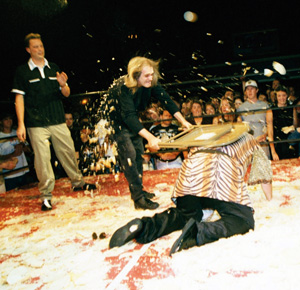CHAIRMAN OF THE RING: Original shock jock Dennis Erectus delivers a splintering blow to wrestler Count Dante.