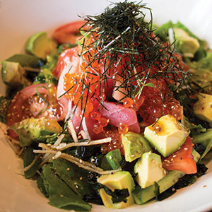 A mound of translucent, tangerine orbs of salmon roe and thin, coral-pink salmon slices perch atop pale green avocado and darker green Romaine leaves. Punctuating this sashimi salad, a sprinkle of seaweed—chopped fine into tiny, even blades—tumbles like cut grass over the dish.