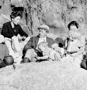 Jack London passed through the Santa Clara Valley on his way to Carmel, as recounted in 'The Valley of the Moon.' London (far right) relaxes at the beach, circa 1907, with, from left, George Sterling, Charmian London, Carrie Sterling, Jimmy Hopper and his children and an unidentified woman. Geoffrey Dunn Collection