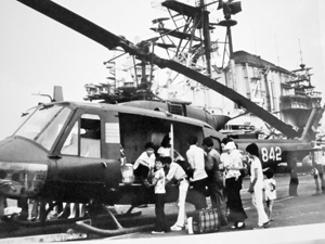 ESCAPEES: On the morning of April 30, 1975, following the fall of Saigon, helicopters filled with frightened people fleeing South Vietnam landed on the deck of the USS Midway. After they were taken on board the choppers were pushed over the side of the ship to make room for more arrivals.