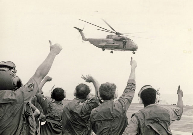 Afternoon of April 29, 1975. The first Marine helicopter lifts off from the deck of the USS Midway on its way to Saigon as Midway crew members and fellow Marines give the thumbs up sign.