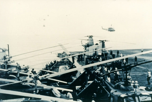 Morning of April 30, 1975, as the Midway prepares to leave Vietnamese waters, crew members and the ships photographer spot scores of helicopters approaching from Vietnam. The crew was uncertain if these were North or South Vietnamese. it turned out they were South Vietnamese helicopters with their radio equipment removed, bringing out terrified refugees from Saigon.