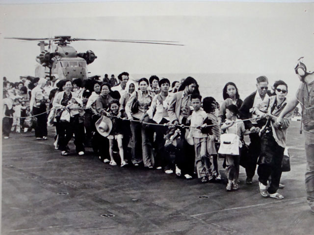 Vietnamese refugees aboard the USS Midway, morning of April 30, 1975. Vietnamese pilots flew their families and friends and other refugees out to the deck of the Midway off the coast of South Vietnam. People exited the choppers and were told to hang onto a long rope in order not to be blown over the side by prop wash. Crew members then led them across the deck and down into the ship.