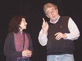 This tendency for people to be misread culminates in Paul Braverman's Storm Warning. (A meteorological photo looking down on the huge swirl of a hurricane cloud fills the projection screen behind the actionset design, Ron Gasparinetti). At the onset of a hurricane, Matthew (John Watson) a world-traveling Carter Foundation analyst finds himself trapped in a Florida elevator with a bumbling, husband-quoting redneck (Terry Boero). At one point, she asks Matt if she's got "stuff hanging out my nose." It's amazing to watch these two cultural aliensBoero's character shifts ever so delicatelymake a touching connection and end up revisiting earlier lines from a totally different angle.