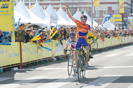 THE WINNER AND ... THE WINNER: Rabobank's Robert Gesink from the Netherlands takes first place coming through the finish line in San Jose on the third leg of this year's Amgen Tour of California. The man trailing but a bike length behind is Levi Leipheimer, who went on to take the Leader Jersey and win his second consecutive tour in Pasadena.