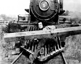 (1927) Time for you so-called cutting-edge mavericks to see what a real movie looks like! (he shouted in a quavering voice, shaking his cane). Buster Keaton, as the engineer Johnny Gray, is tricked out with a feathery coiffure and a huge cravat, like a caricature of a romantic poet. Johnny has two loves in his life. One is a girl, Annabelle (Marion Mack); the other is his locomotive, the General, which is stolen and hauled across the border. In retrieving the engine, Johnny gets to become what he wanted to be: a hero in Annabelle's eyes. The comedy of war is Keaton's theme here—the gun that misfires and kills the wrong man, the sword that flies off the handle—ideas all summed up in the sequence in which Buster is chased by a huge, snub-nosed cannon that has almost-human intelligence. Chris Elliot at the Wurlitzer. (RvB)