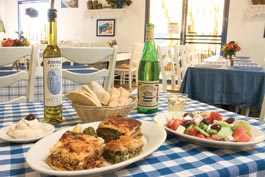 Offbeat Offerings: Left to right: taramosaláta; a plate of pastitsio, dolmades and spanakópita; horiátikisaláta.