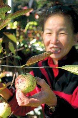 Picking on Silicon Valley: Katie Wong examines a tropical guava in her backyard, which is one of the last remnants of this area's former ag utopia.