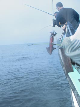 As dawn broke over the eastern dairy-land hills of Sonoma, the 65-foot-boat steadily filled with fishermen. Each had a pocket full of cash, a heavy-duty fishing rod and images of monster squid dancing in his head. When 30 of the 35 expected fishermen had signed in, our captain called us back to the stern of the vessel to give his morning introductions.