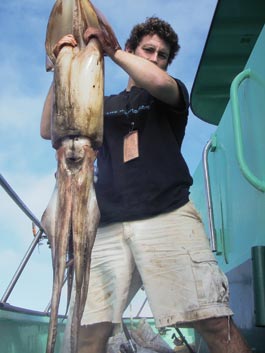 I set my rod down for a moment to make an exact count and an estimation of the slimy biomass we would soon be cramming into my brother's car. Deckhand Rudy saw my idleness and hurried over to ask why I was not attempting to catch another squid.
