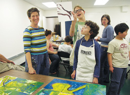 With two aids in tow, they chatter, sit, stand, explore, sit as Gittelsohn explains the objective through the din. Colors flow; paints, papers, brushes are in disarray, and it's over in a matter of minutes. Watching the kids interact with the project at hand, you see moments of intense concentration, of delight, of being engrossed in the hand-to-eye experience—but the majority of these moments are measured in seconds, split seconds.